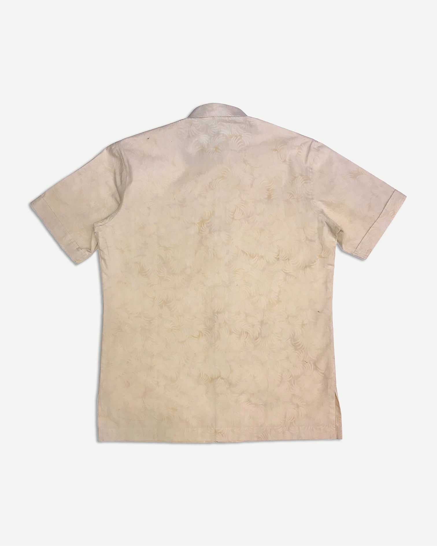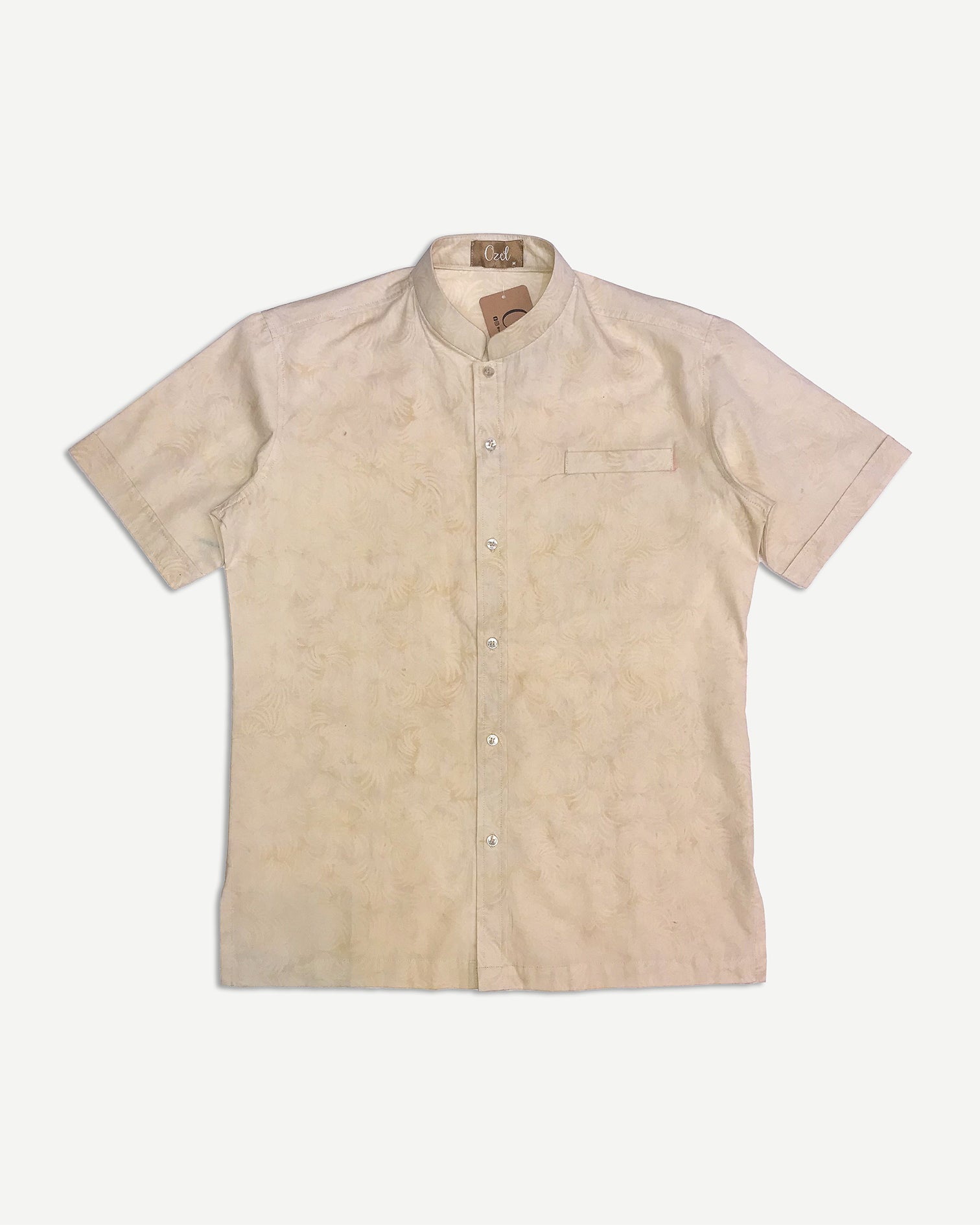A cream-colored batik shirt with subtle leaf motifs, perfect for any occasion. Timeless, minimalist, and versatile.