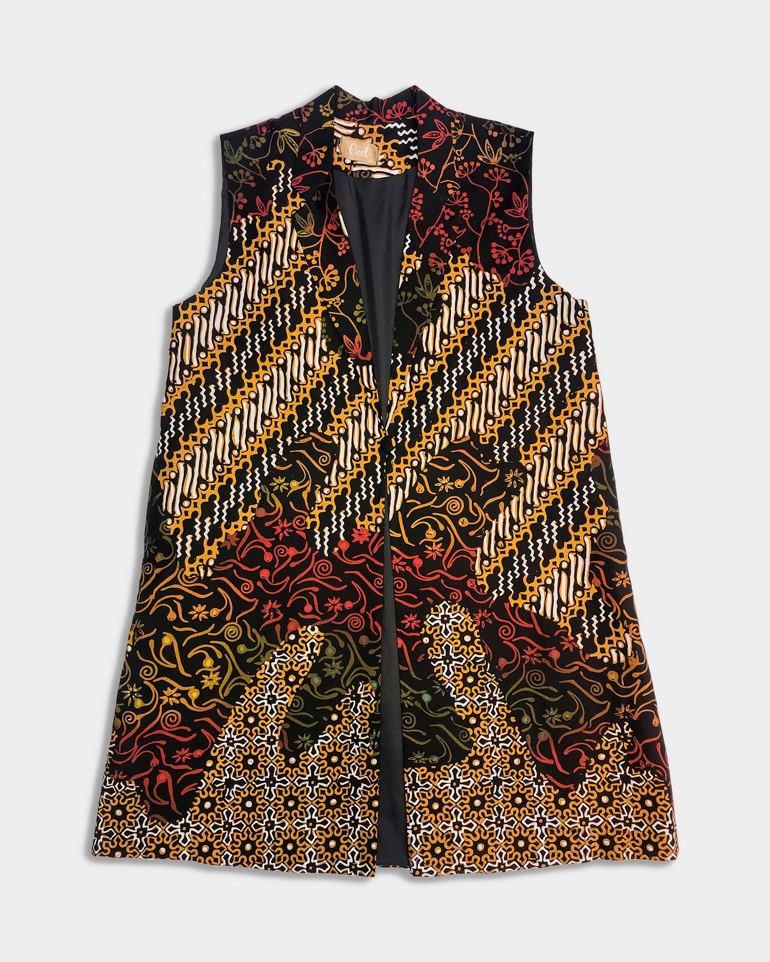 Sleeveless Peacoat, Gilded embodies elegance and pride. Thegolden patterns exudes warmth, while the parang motif shows strength & power.