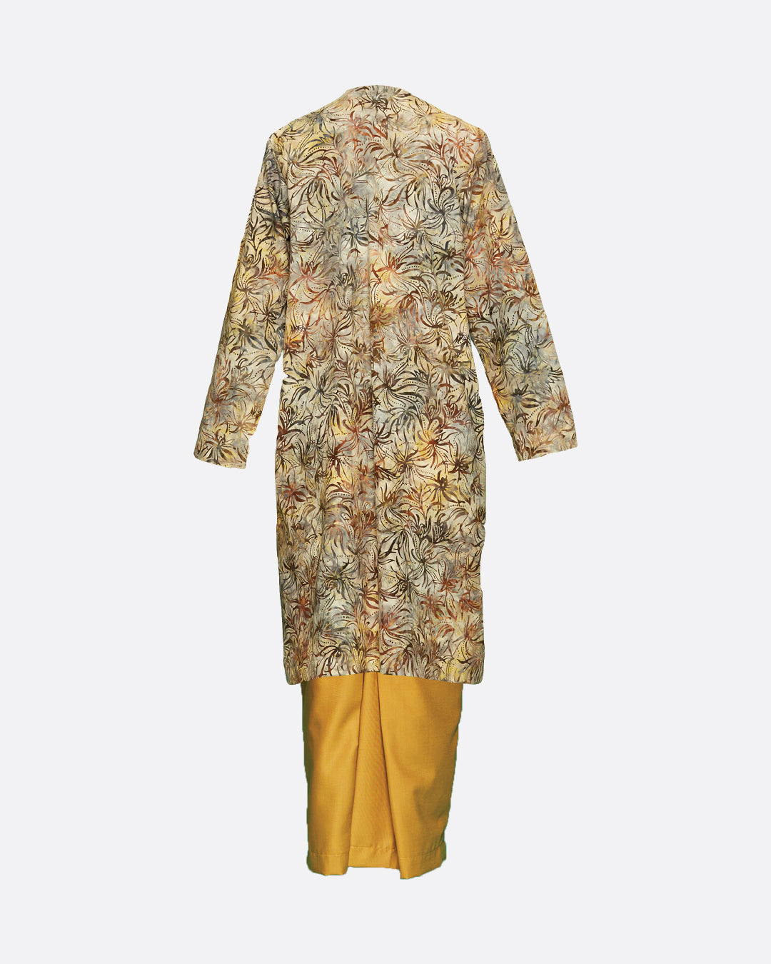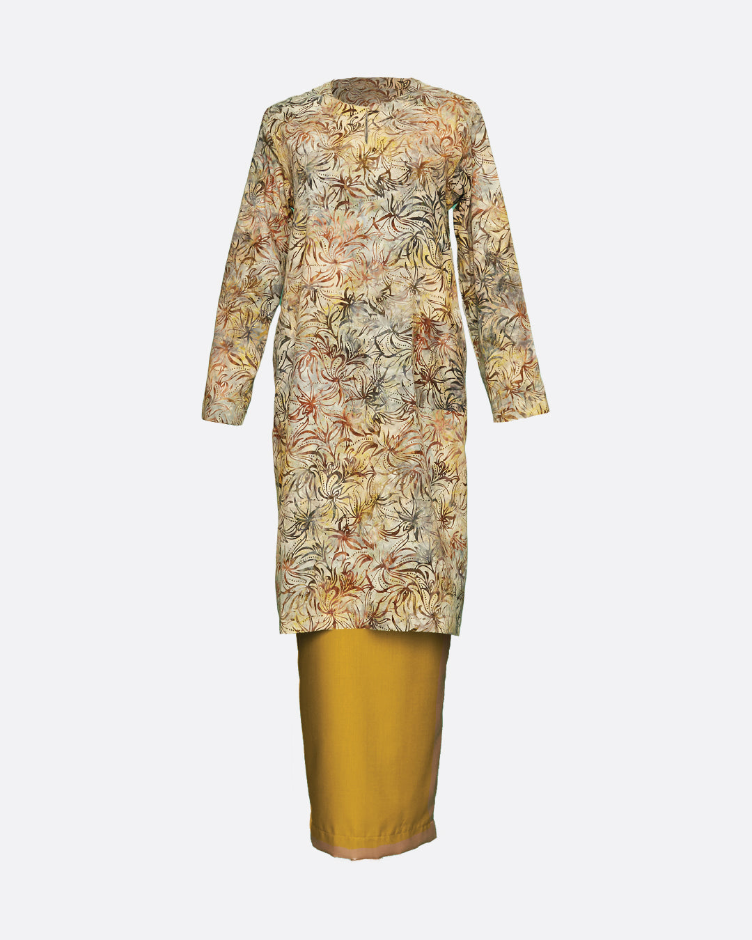 Flowerdot Kurung in Light is a set, top and mustard coloured bottom. A classic modern Kurung Pahang with a pocket. It is a regular to a loose fit, with round neckline and batik covered button. Paired with green coloured skirt.