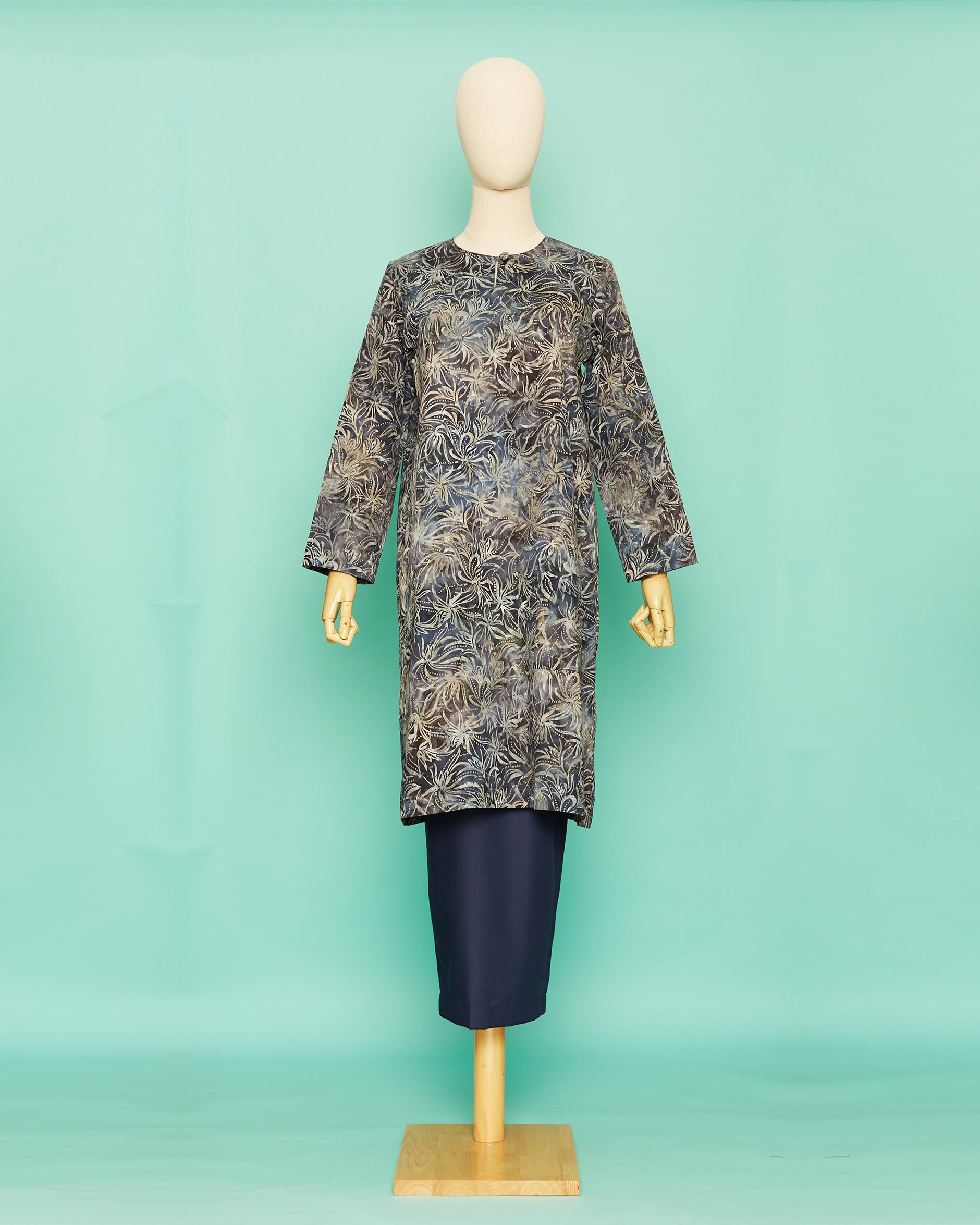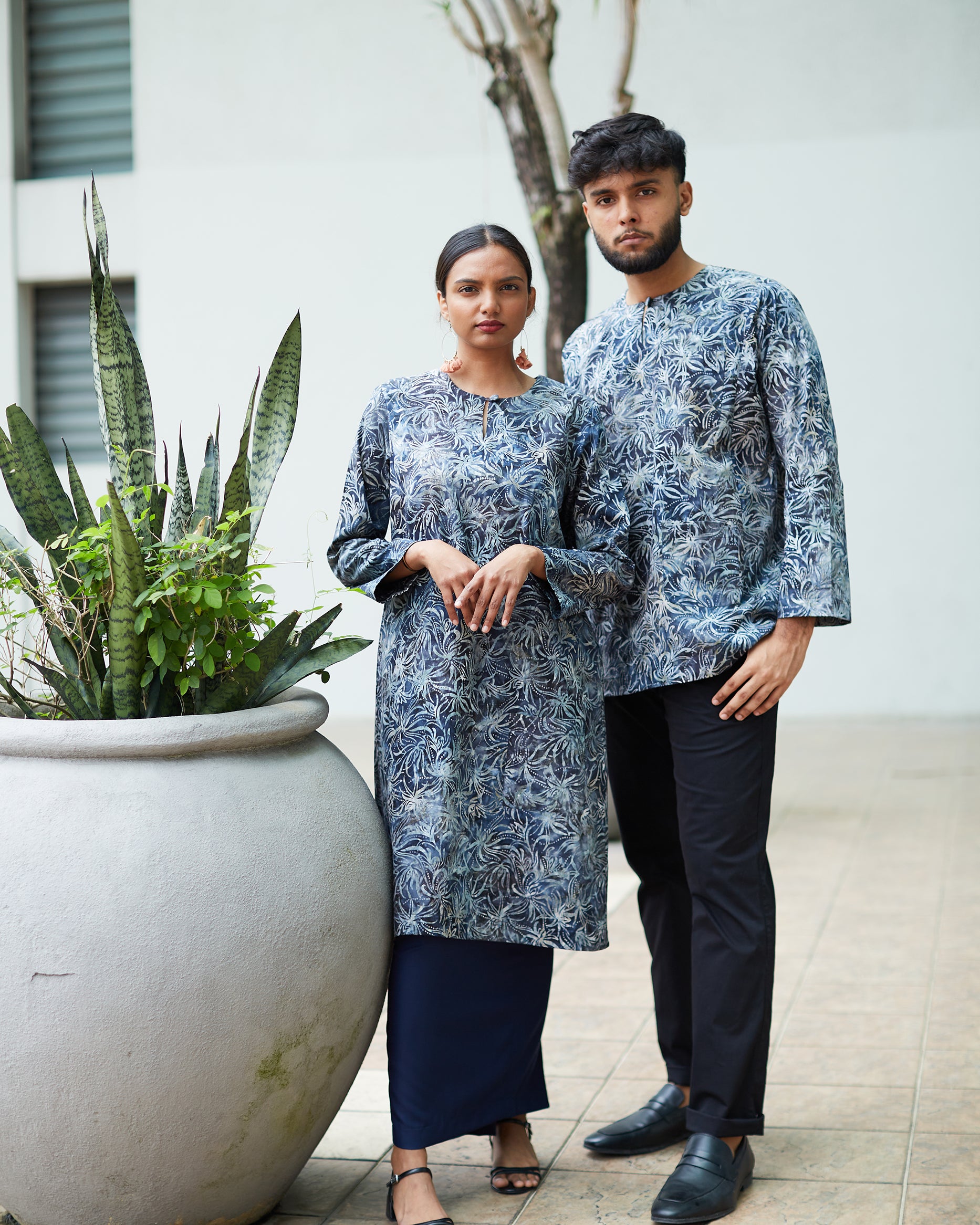Flowerdot Kurung in Navy is a set, top and bottom. A classic modern Kurung Pahang with a pocket. It is a regular to a loose fit, with round neckline and batik covered button. Paired with navy blue coloured skirt.