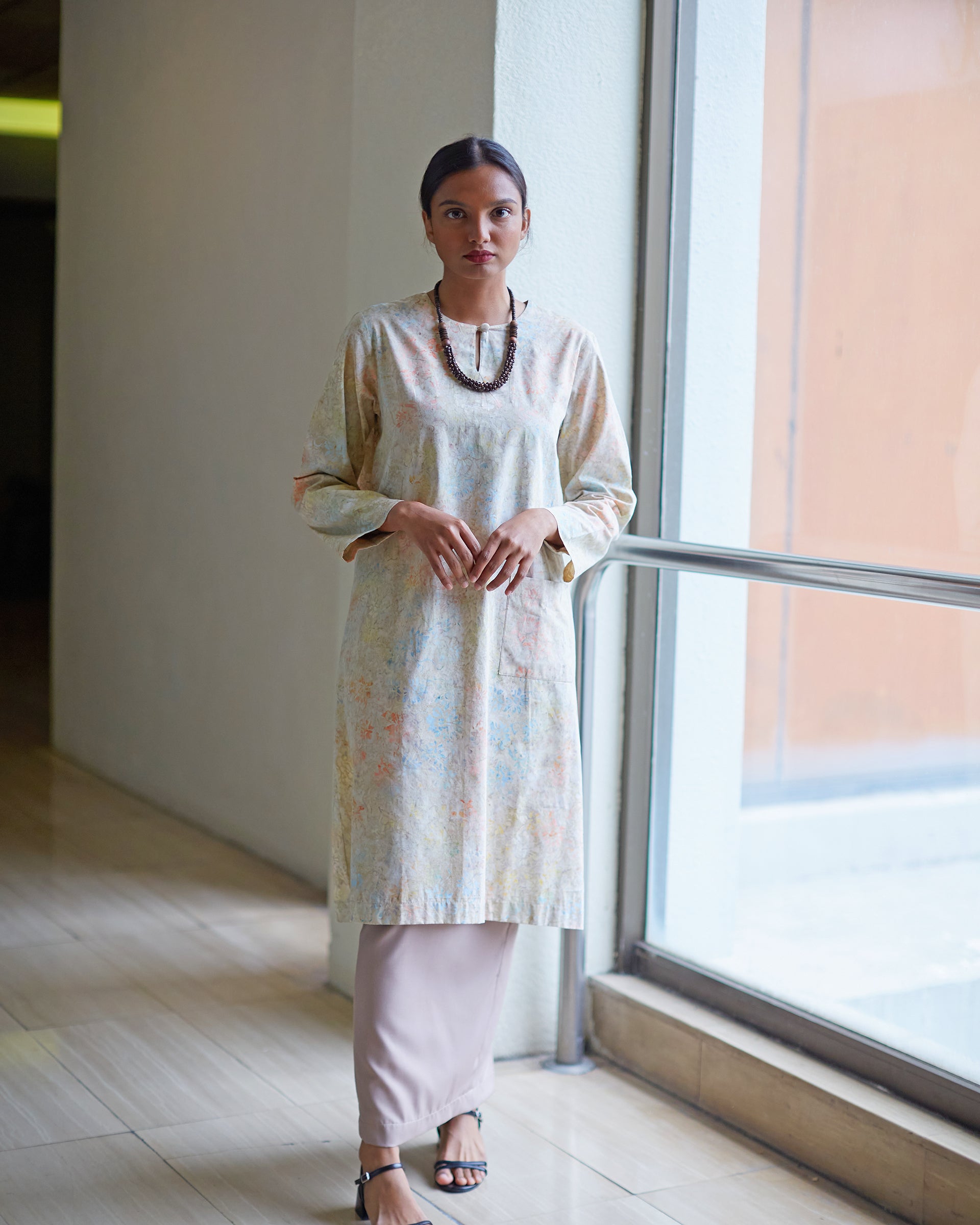 Pastel Petals Kurung is a set, top and bottom. A classic modern Kurung Pahang with a pocket. It is a regular to a loose fit, with round neckline and batik covered button. Paired with khaki coloured skirt.